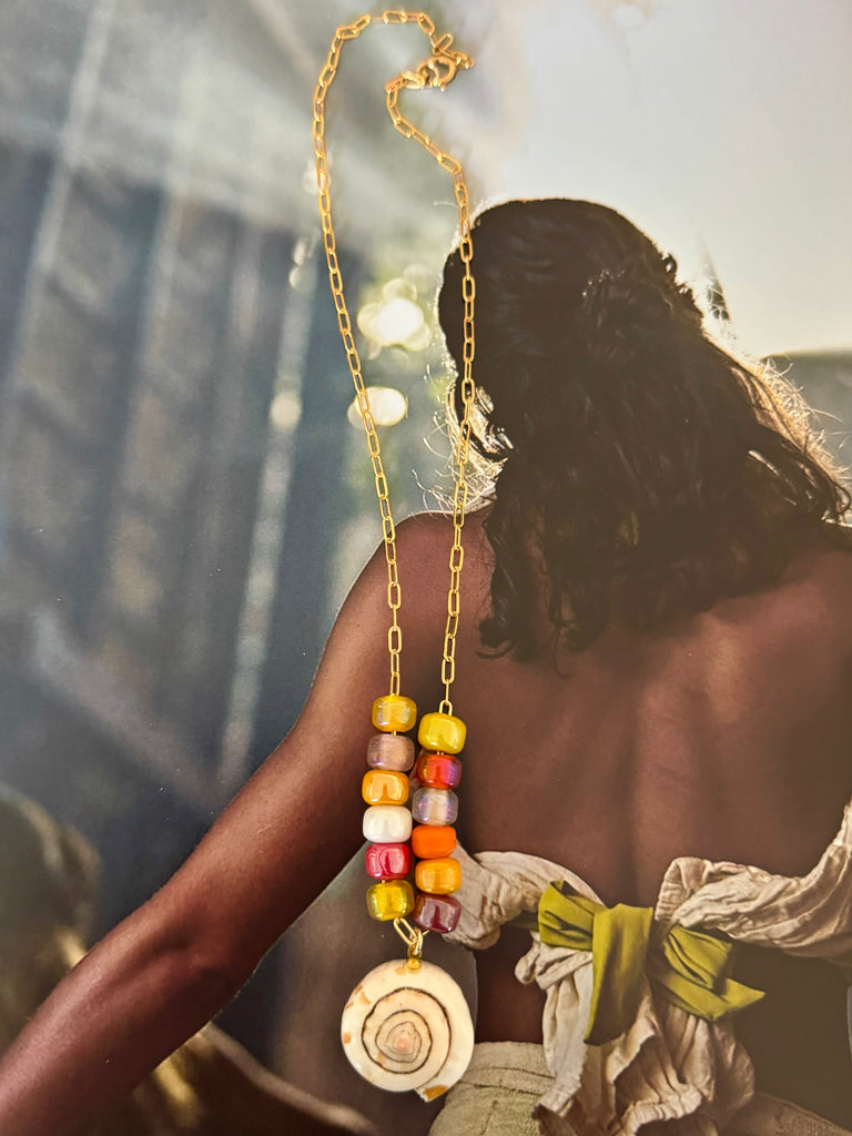 SEASHELL WITH SUNSET COLORED GLASS BEADS AND GOLD FILLED LINK CHAIN