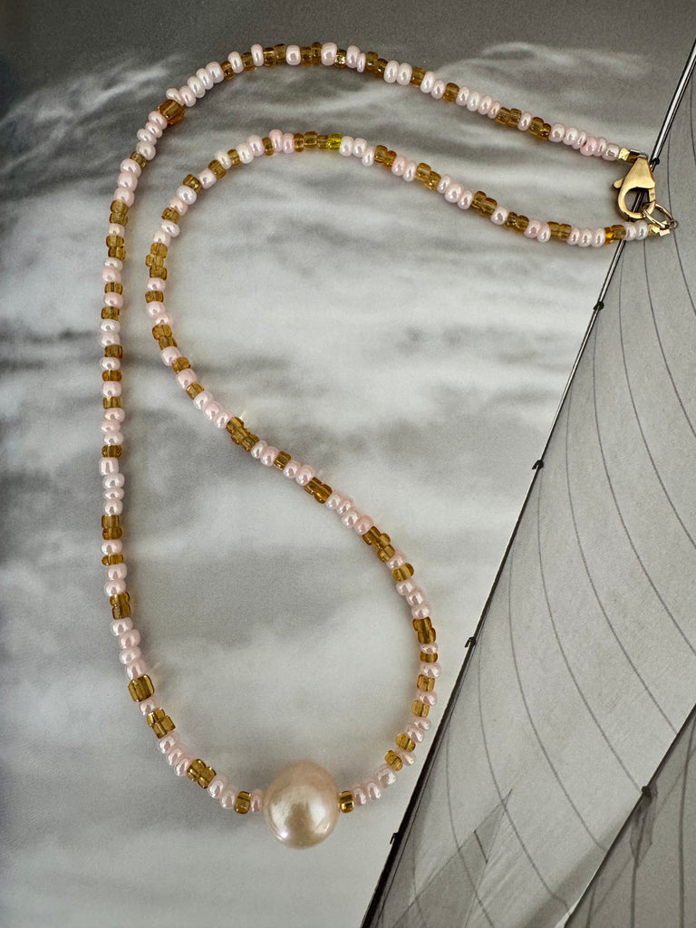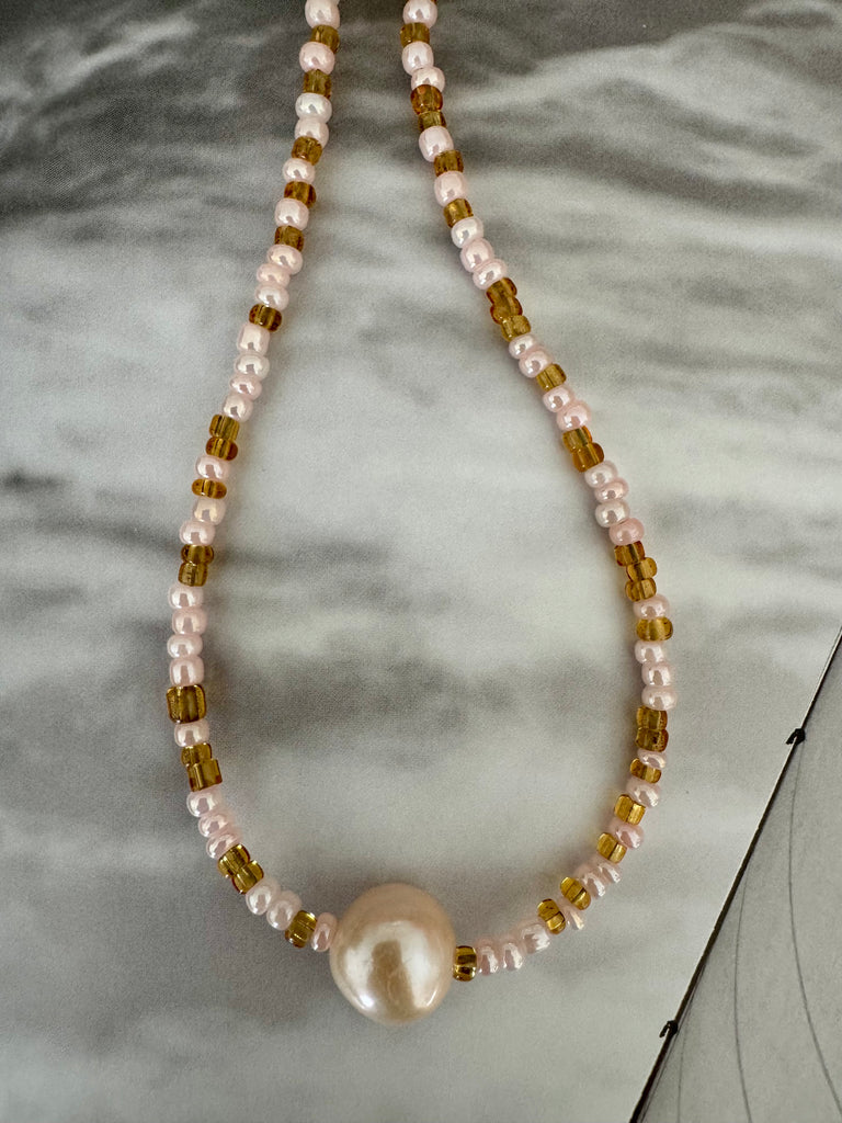 SINGLE FRESH WATER PEARL WITH PINK AND GOLD AFRICAN GLASS BEADS