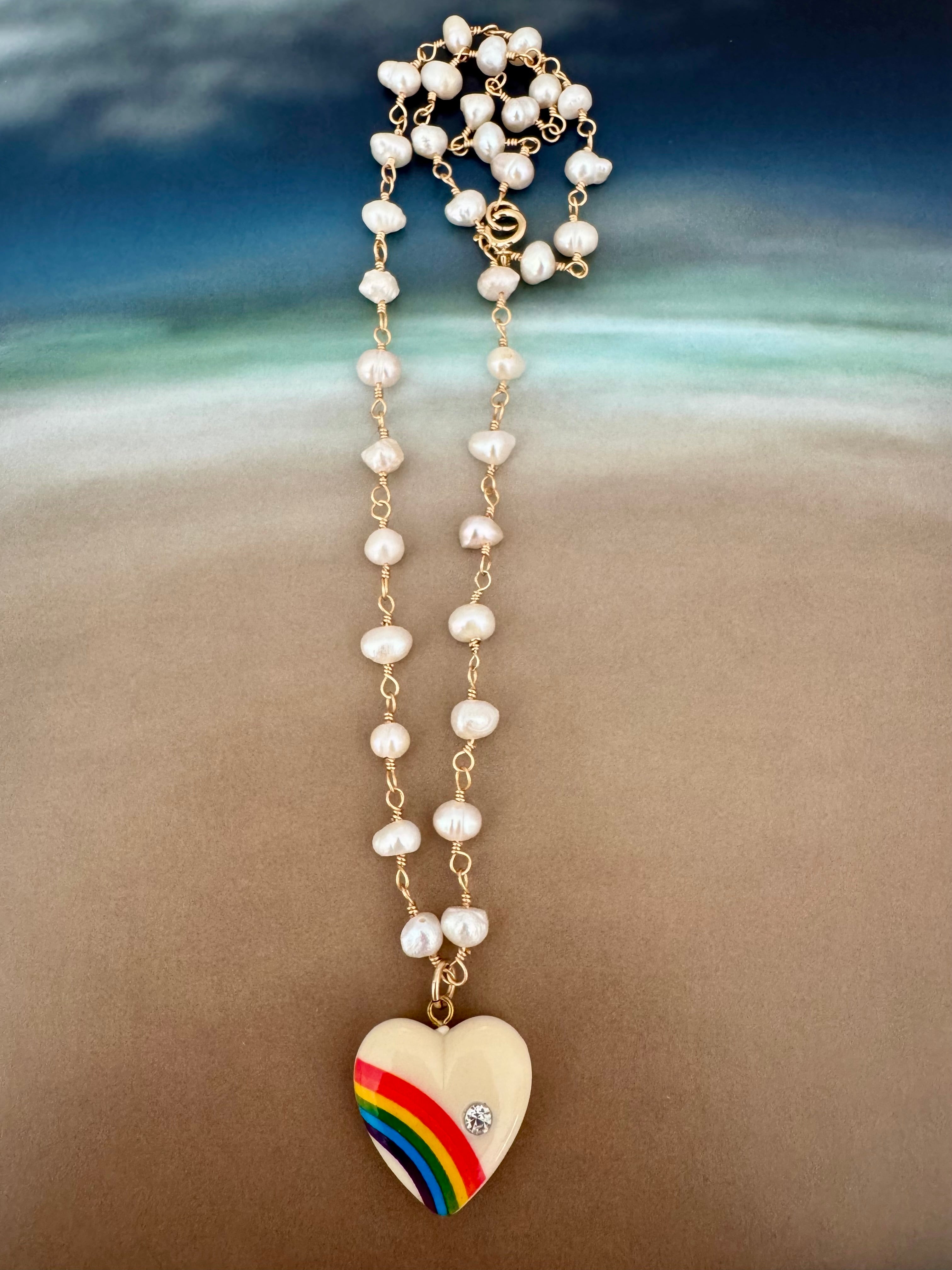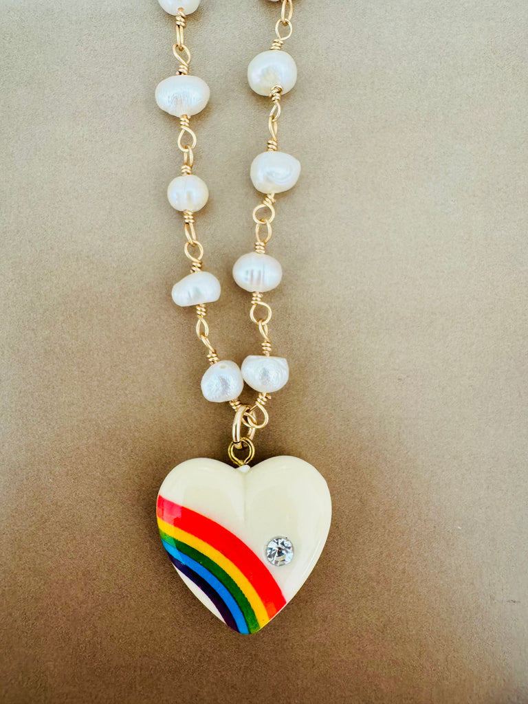 LARGE VINTAGE ACRYLIC WHITE RAINBOW HEART WITH LITTLE RHINESTONE FROM THE 1970'S