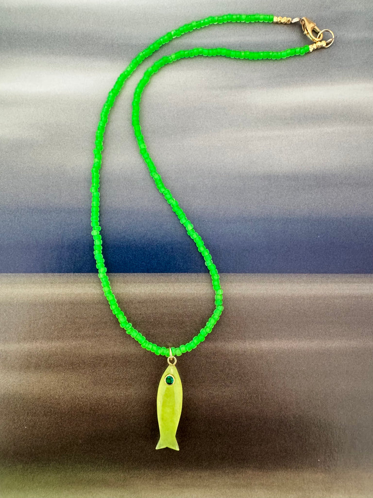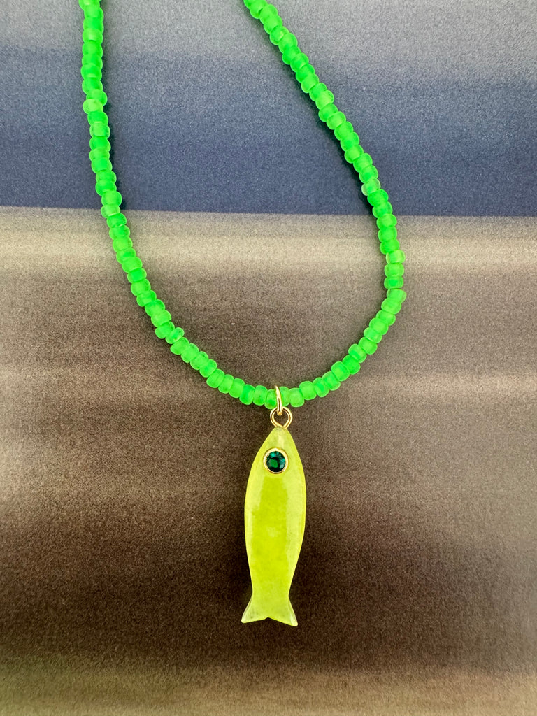 PREHNITE JADE FISH CHARM 1 1/4" WITH NEON GREEN GLASS SEED BEADS