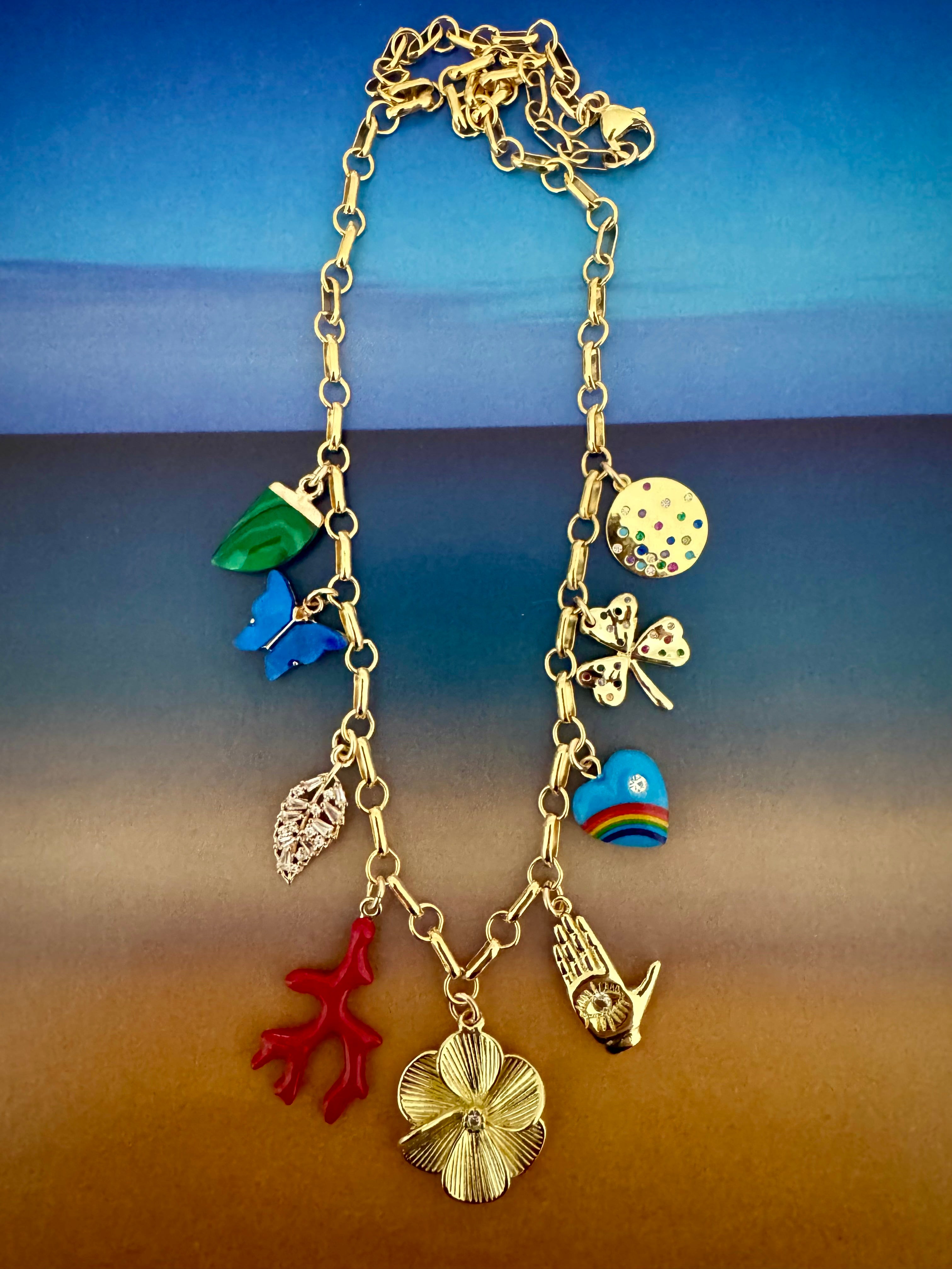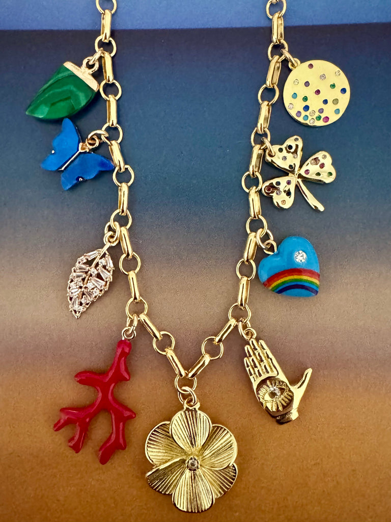 ONE-OF-A-KIND CHRAM NECKLACE WITH 9 CHARMS, GOLD FILLED FLOWER CHARM IN CENTER